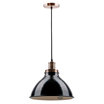 Colgante construido en acero. Portalámpara E27. Terminación en pintura horneada, terminación del florón y capuchón superior bronce viejo, con cable textil negro.