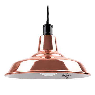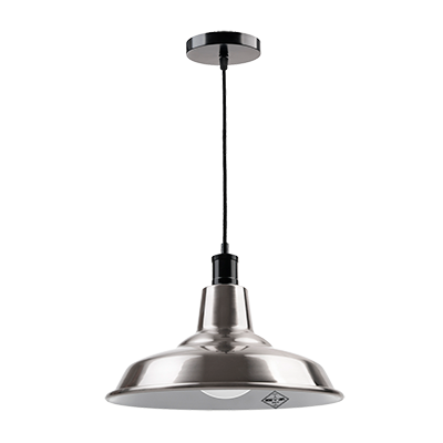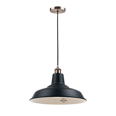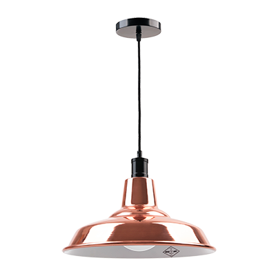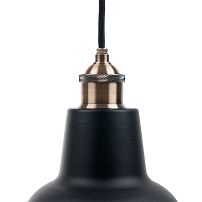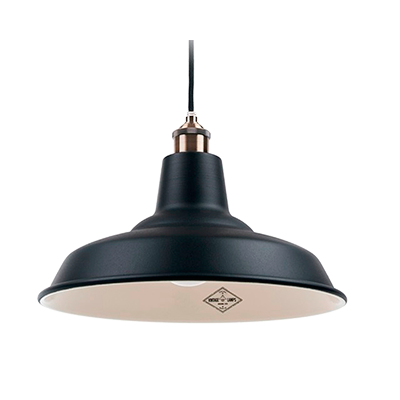 Colgante galponero construido en acero, terminación en pintura horneada, terminación del florón y capuchón superior niquelados o terminación baño de cobre, platil o bronce mate, terminación del florón y capuchón superior en color negro semimate, con cable textil. Portalámpara E27.