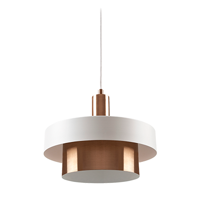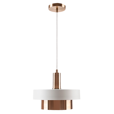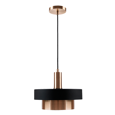 Colgante construido en acero, terminación con pintura en polvo termoconvertible poliéster, combinado con baño oro mate laqueado. Portalámpara E27. Cable textil de 1,5 metros.
