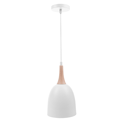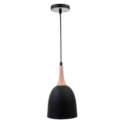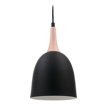 Colgante construido en acero, terminación con pintura en polvo termoconvertible poliéster, combinado con madera de lenga natural. Portalámpara E27. Cable textil de 1,5 metros.