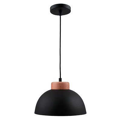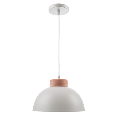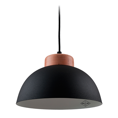Colgante construido en acero, terminación con pintura en polvo termoconvertible poliéster, combinado con madera de lenga natural. Portalámpara E27. Cable textil de 1,5 metros.