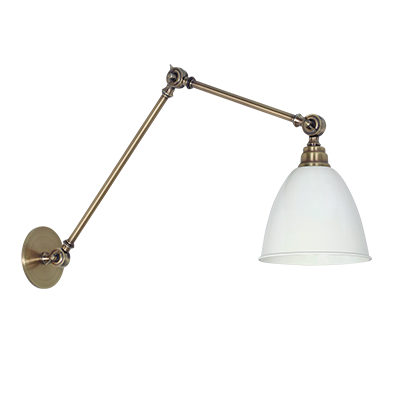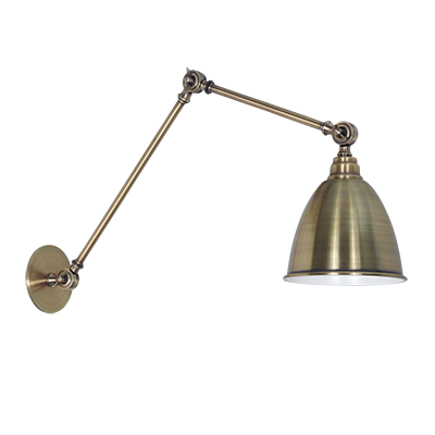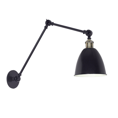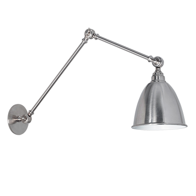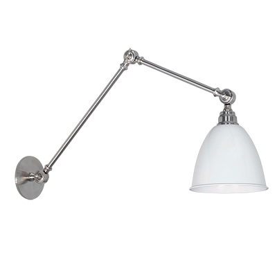 Aplique de pared con brazo articulado doble, construido en acero. Movimientos de zamak dentados. Terminación pintura poliester en polvo horneada a 200º o baño electrolítico laqueado y horneado. Portalámpara E27.