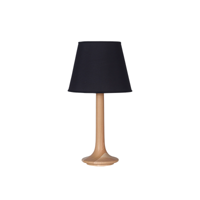 Lámpara de mesa o velador fabricado en madera torneada de lenga. Terminación natural, con pantalla de tela cónica o cilíndrica en lino natural o lino negro