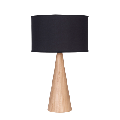 Lámpara de mesa o velador fabricado en madera torneada de lenga. Terminación natural, con pantalla de tela cónica o cilíndrica en lino natural o lino negro